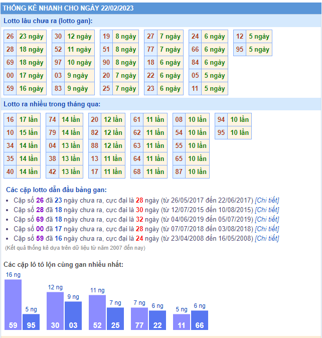 – Cầu Lotto đẹp nhất ngày 22/02/2023: 45, 87; 36, 24; 51, 38; 65, 37; 17, 34; 65, 82; 39, 74; 42, 58; 66, 32; 85, 40.